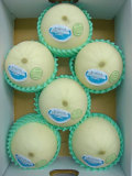 皮の色は白色で果肉は緑色。果肉は厚く、皮の近くまで均等で果汁が多く滑らかな肉質です。発酵性もほとんどなく、日持ちの良いメロンです。